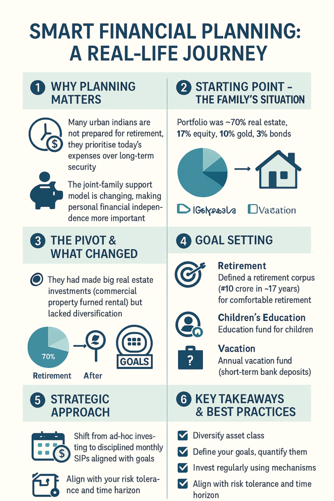 Aditya Sharma’s financial journey exemplifies how thoughtful diversification, professional guidance, and disciplined execution can transform one’s financial future. His transition from real estate-heavy investments to a balanced, goal-oriented portfolio demonstrates that it’s never too late to take control—provided one is willing to plan, act, and stay consistent.