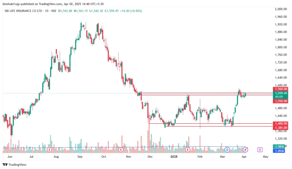 Source: Tradingview, SBI Life Insurance – Daily Chart, showing sideways consolidation