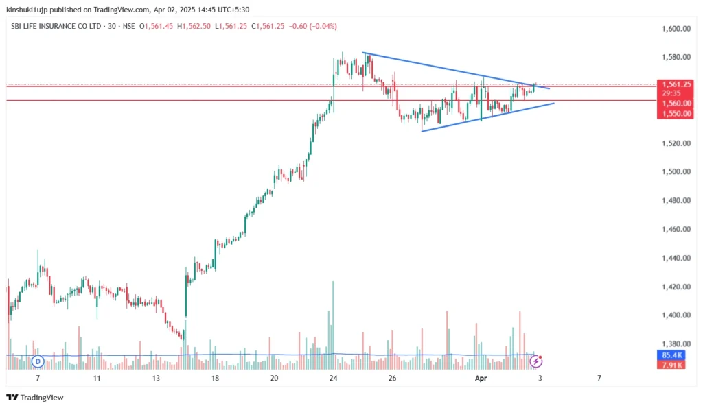 Source: Tradingview, SBI Life Insurance – 30-minutes Chart, showing symmetrical triangle pattern.