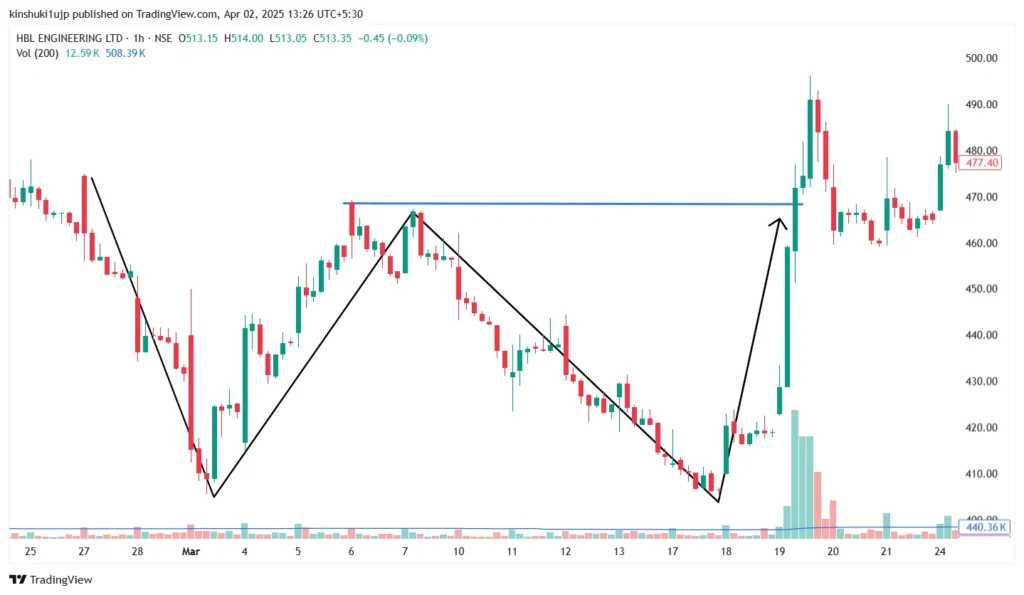 Source: Tradingview; HBL Engineering – 1hour chart, showing a double bottom pattern formation in March 2025.