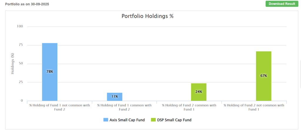 Dezerv has created a modern and highly interactive mutual fund overlap calculator specifically for equity investors. The tool allows comparison between two mutual funds and visually presents the results using Venn diagrams and charts, making the overlap analysis simple and quick to interpret. It categorizes overlap into Low (0–20%), Moderate (20–60%), and High (60%+), helping investors instantly assess their risk exposure. According to Dezerv’s data, overlaps between large-cap funds in India typically range from 35% to 55%, showing that many portfolios are less diversified than they appear.